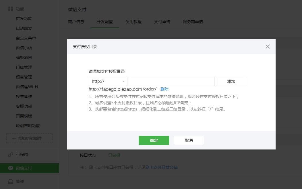 10.支付授权目录 选择http:// 填入facego.biezao.com/order/