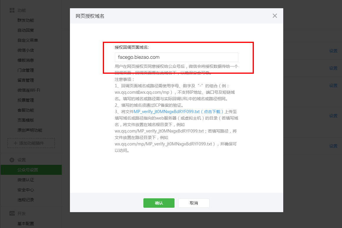 8.网页授权域名填入facego.biezao.com