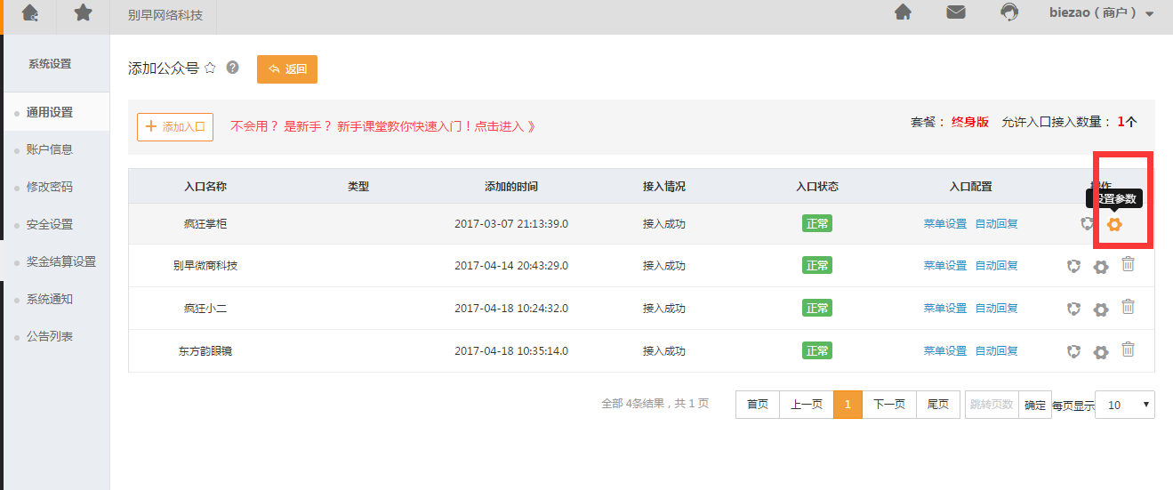 1、别早后台- 系统设置 - 通用设置 - 添加公众号 - 添加入口,