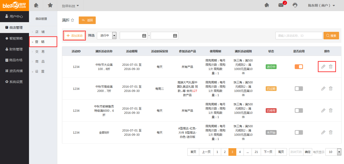 选择【满折】后,通过【添加活动】创建一个优惠活动,或者在已经创建的基础上【编辑】本次活动信息,如下图: