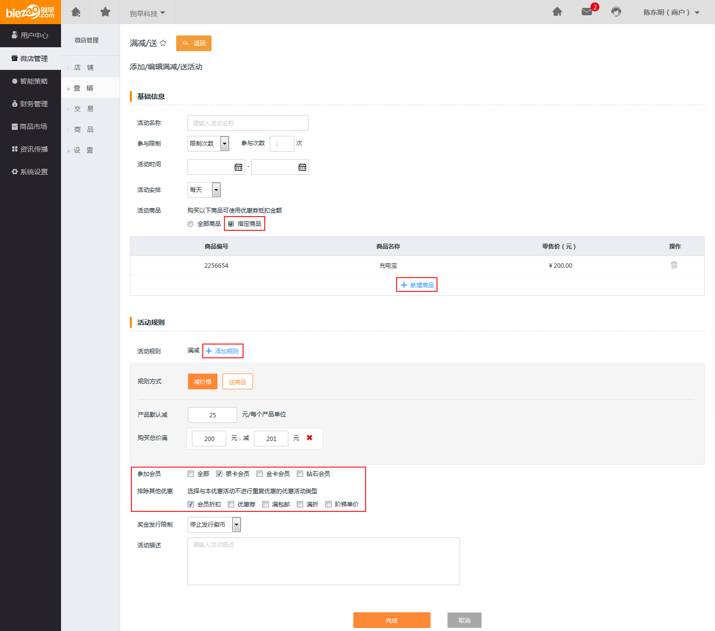 可以选择【全部商品】或者【指定商品】,填写相应的活动信息及活动参与的会员类型、规则,点击完成:
