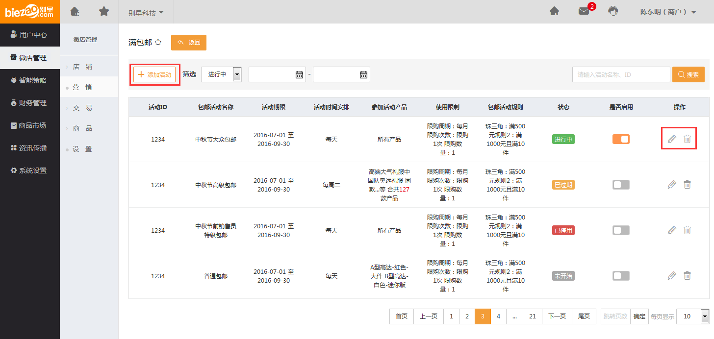 选择【满减】后,通过【添加活动】创建一个优惠活动,或者在已经创建的基础上【编辑】本次活动信息,如下图: