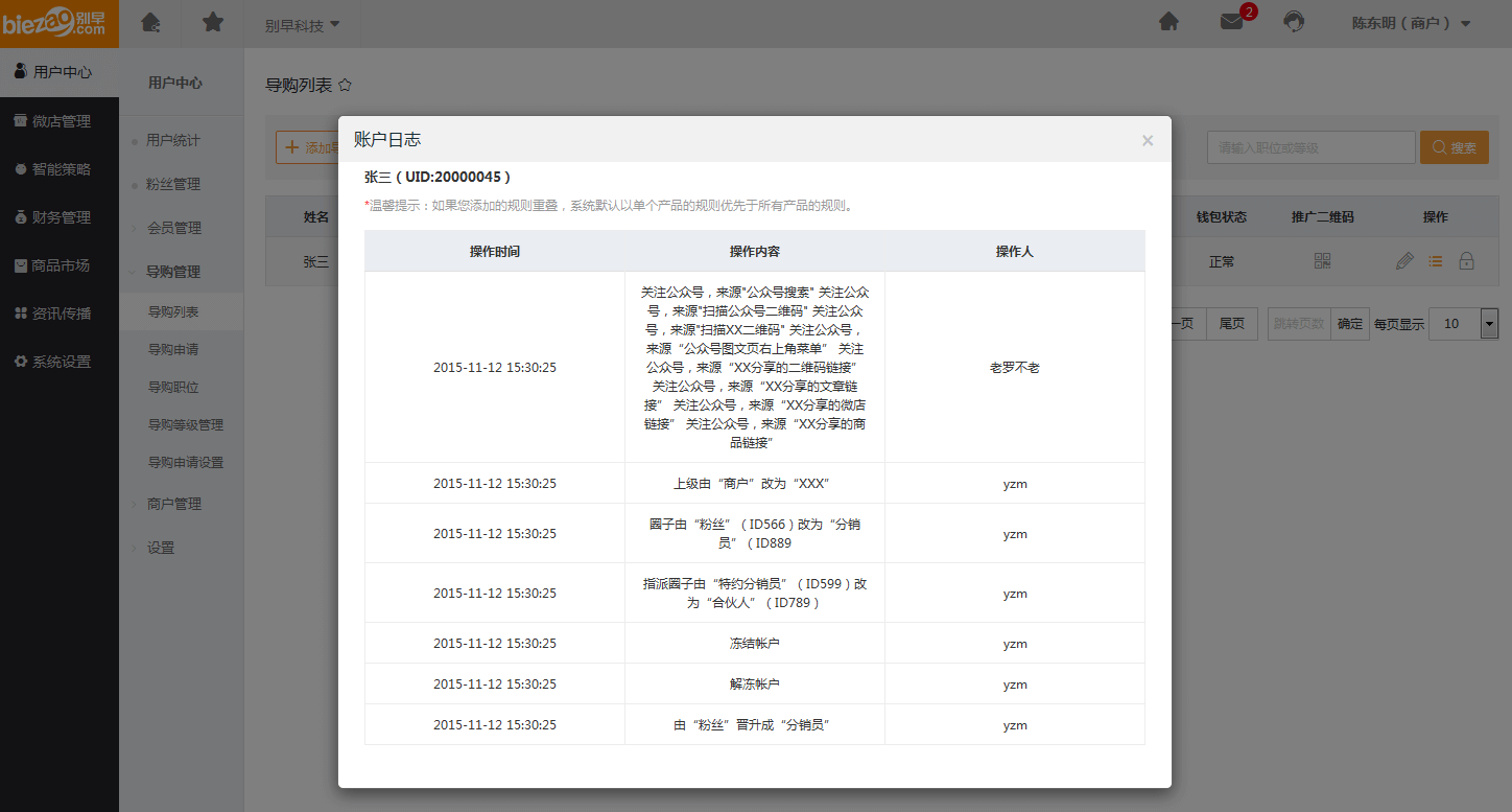 (4)点击【账户日志】,可以看到该导购员对系统的操作记录,如下图:
