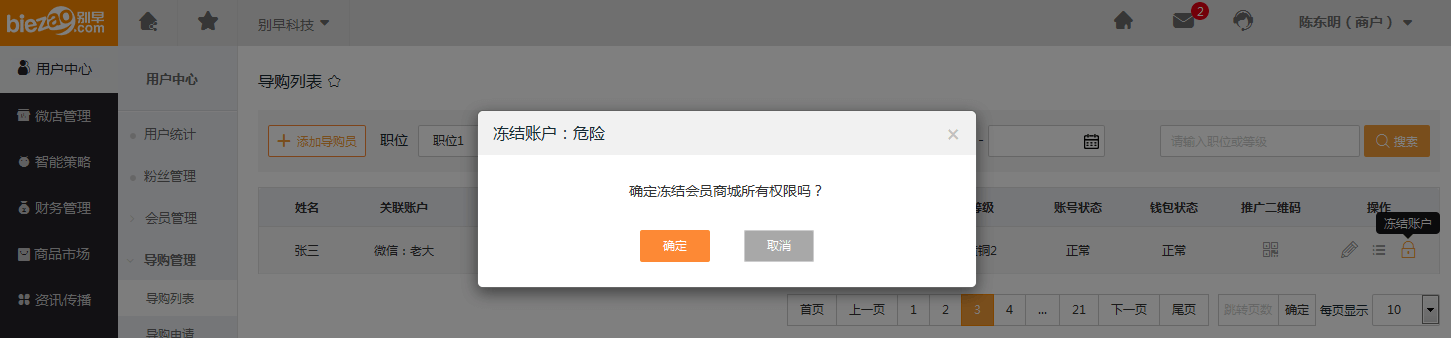 (5)谨慎点击【冻结账户】,因为会冻结会员在商城的所有权限,如下图: