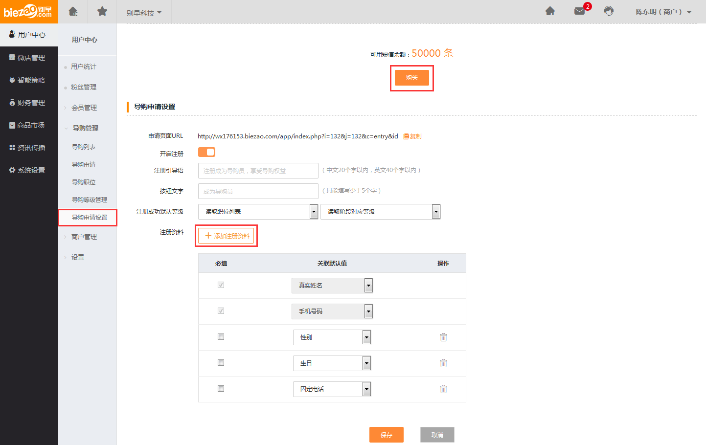 【导购等级管理】主要是申请导购员职位的设置,可以【购买短信】和【添加注册资料】,如下图: