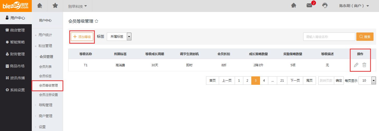【会员等级管理】是对会员等级的管理,这里有【添加等级】和【编辑】两大功能,如下图: