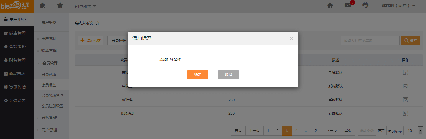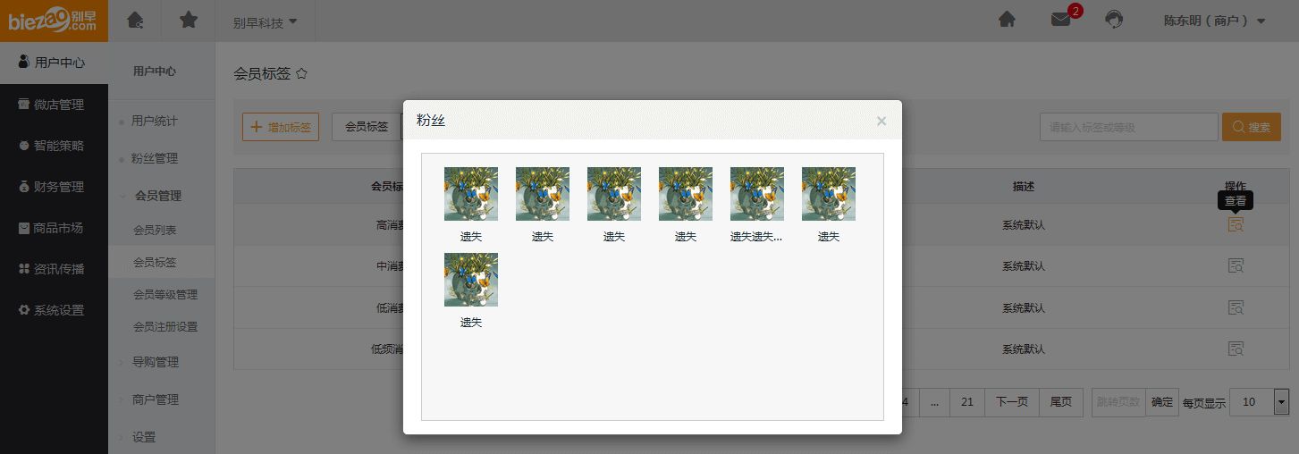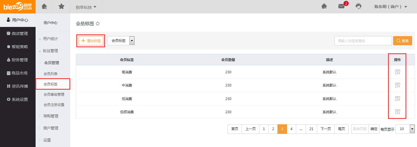 【会员标签】是管理会员消费等级,了解会员数量、备注信息、查看详细信息,如下图: