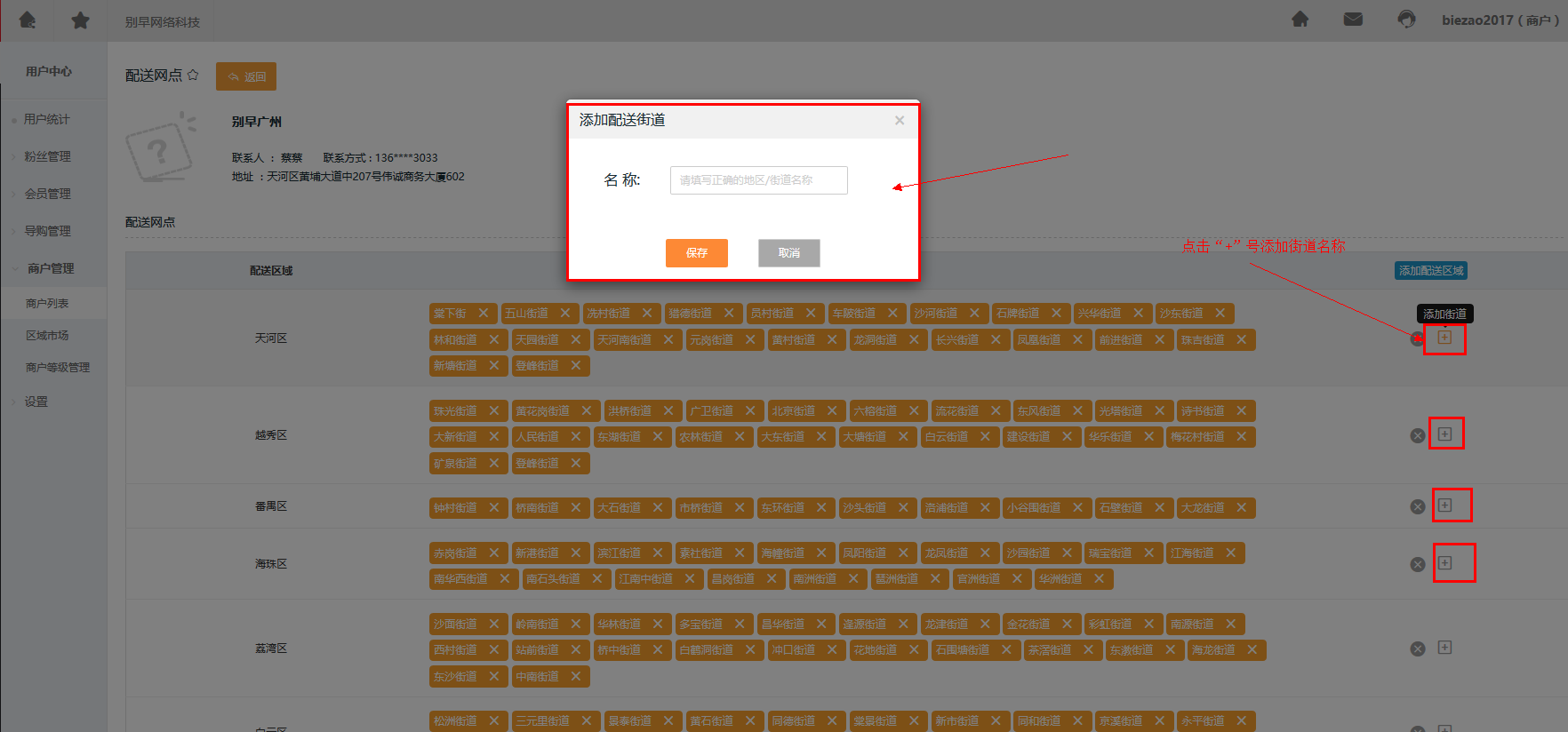 第三步 添加配送区域,例如广州的天河区、越秀区等。