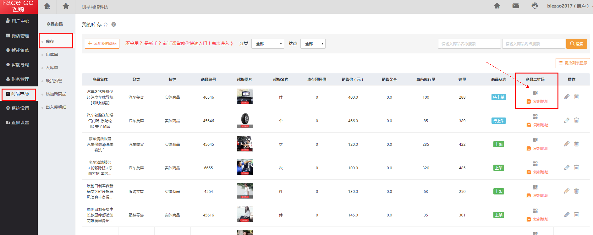 二维码下载路径:商品市场 -> 库存 -> 商品二维码
