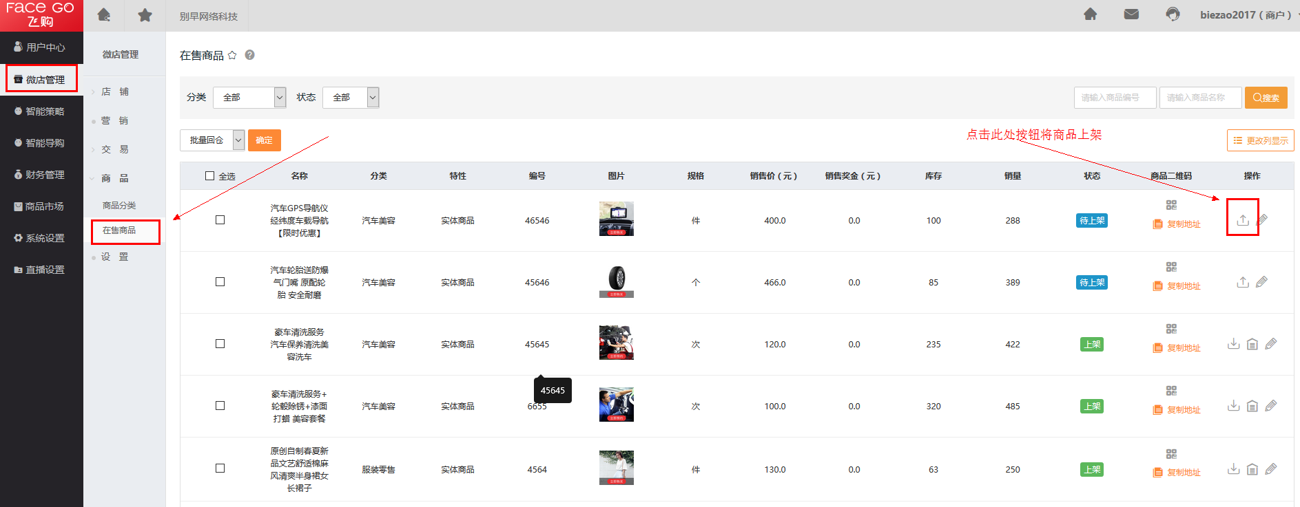 进入微店管理 -> 在售商品 -> 上架